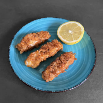 Wildlachsstäbchen mit Kartoffelstampf und Erbsen-Möhren-Gemüse